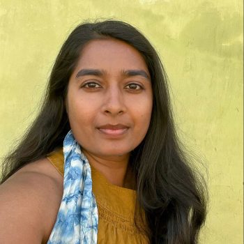 Roshni Kavate is an artist, palliative care nurse and archivist whose practice is rooted in ancestral mark-making and the exploration of the liminal space between us, the elements and the imprints of the bodies we inhabit. Roshni Kavate comes from a lineage of South Indian artisans who survived colonial incursions by hand weaving plant-dyed silk textiles. Roshni’s practice weaves together visceral, sensory interpretations of memory, place and home through a variety of mediums including textiles, sound sculptures, storytelling and participatory community performances. Most recently, Roshni has been exploring culinary storytelling, pleasure and grief as seeds for connecting to corporeal archives, reimagining diasporic journeys and sculpting ephemeral ancestral cosmos that serve as altars for a post-colonial future. Roshni is inspired by the profound memories and longings that people share at the end of their lives. In a world of digital transience, Roshni delights in the repetitive movement of the hand, stamping, stirring, staining, sealing, marking and sounding to engage in a radical exploration of the body as a limitless constellation. Roshni is a founding member of the Mango + Okra collective alongside Agnes Essonti and Lizette Nin. Recent residencies include Tangent Projects, Barcelona and Kala Printmaking Residency in Berkeley, California.